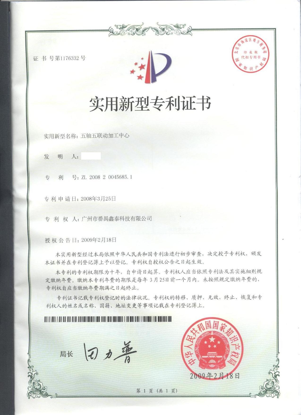 經過公司技術部門員工的辛勤努力,鑫泰集團獲得“五軸五聯動加工中心”的實用新型專利